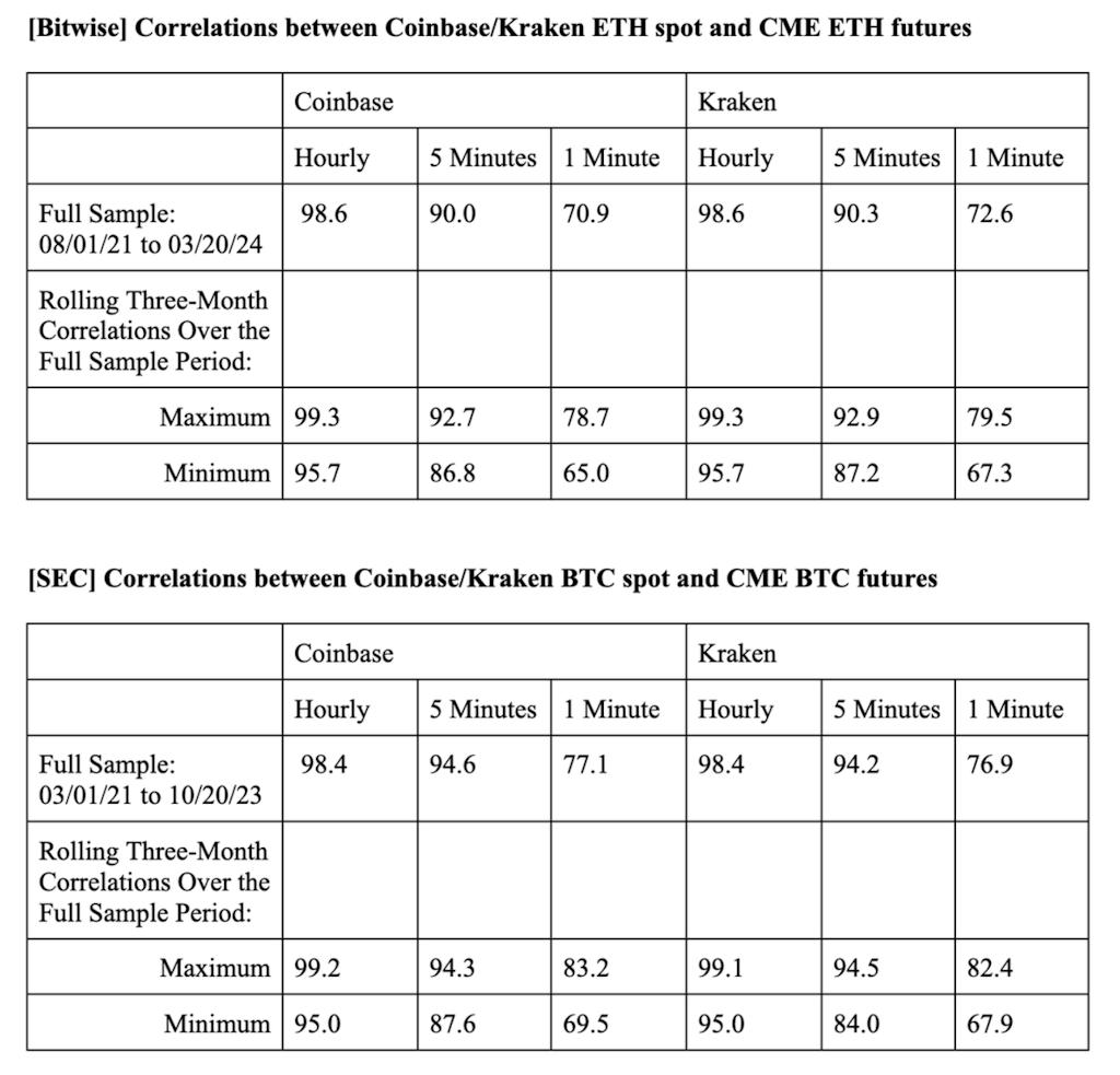 Bitwise, a fund group with its own ether ETF filing, submitted a data analysis showing what it called a correlation between the ETH futures and spot markets that are “substantially similar” to that of bitcoin.