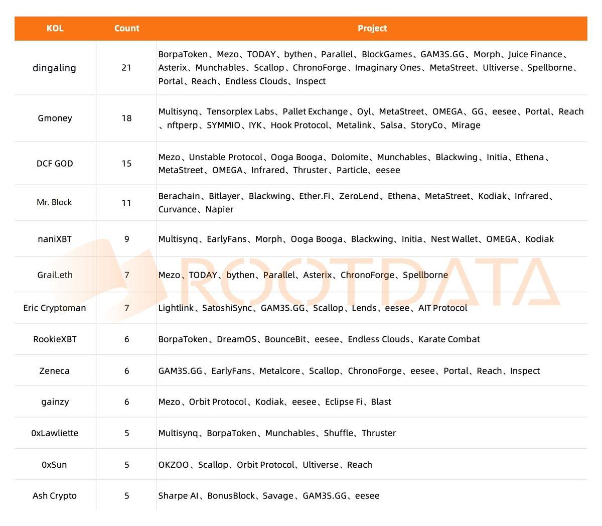 In April 2024, Web3 asset data platform RootData released statistics on KOLs' participation in project financing in the past six months . Dingaling ranked first with 21 project financings, GmoneyNFT and DCF GOD ranked second and third. Today, Odaily Odaily will work with you to disassemble KOLs' investment strategies from this table and find new Alpha.