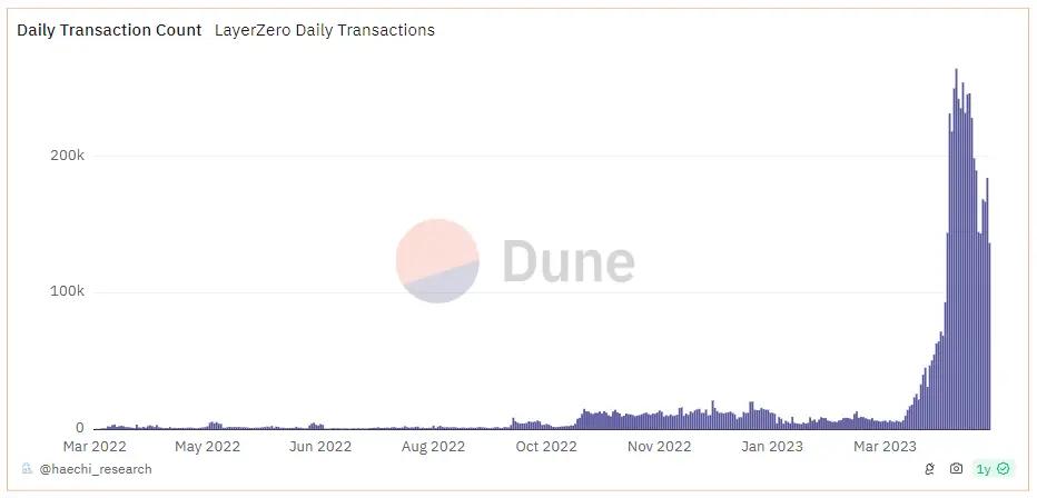 Against the backdrop of the rapid development of cryptocurrency and blockchain technology, LayerZero has highlighted its importance in the industry with its significant growth in transaction volume and user interaction. Data shows that LayerZero's daily transaction volume exceeded 200,000 in March 2023, indicating its widespread adoption and practicality in the blockchain community.
