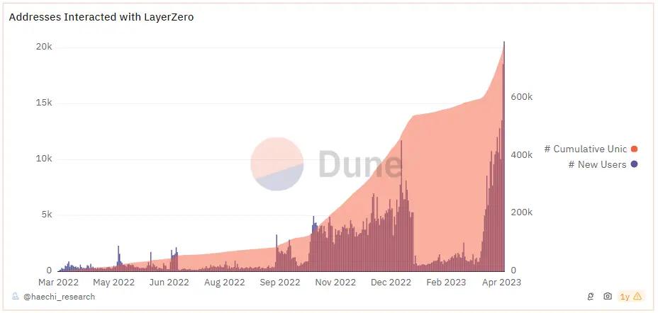 In addition, the number of independent addresses interacting with LayerZero has also increased significantly, with the cumulative number of users approaching 600,000 by April 2023. This reflects the high level of engagement with LayerZero and the trust of its users.