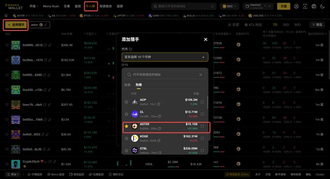I see a lot of people trying to track who's making money on #Aster. I recommend using web3.binance.com/referral?ref=...… Then find the large MC memecoin Hunter under the Experts List and type in aster to see these addresses. It's very fast. You can also monitor and track them directly.