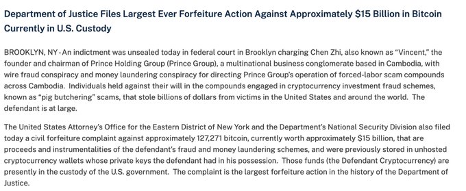 In conjunction with the U.S. Treasury Department's action: - The U.S. Attorney's Office for the Eastern District of New York and the U.S. Department of Justice's National Security Division also filed a civil forfeiture action today against Prince Group for approximately 127,271 bitcoins (currently valued at approximately $15 billion) implicated in the Prince Group scheme. - twitter.com/fishkiller/status/...