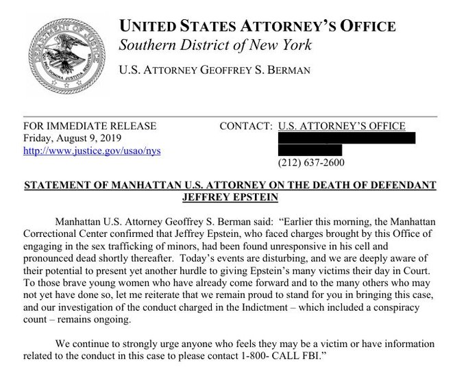 This same court, in documents released last month, had prepared the statement of #Epstein's death a day in advance.