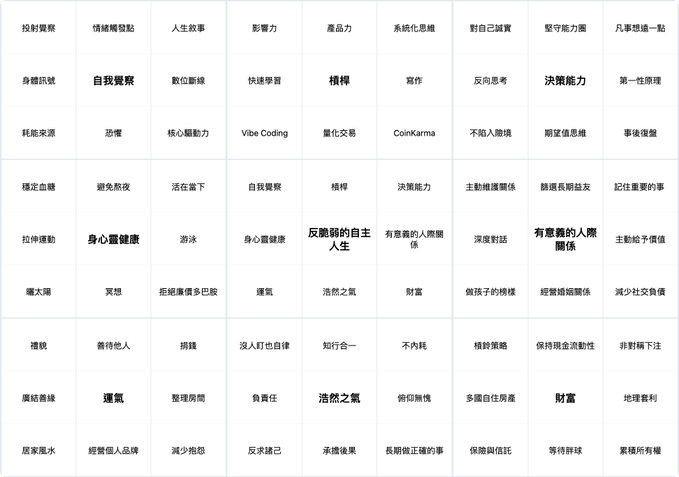 A while ago, the nine-square mandala suddenly became very popular. Shohei Ohtani used it to set his career blueprint, and Yang Yongwei also shared his nine-square grid goals. Suddenly, this tool was labeled as "used by successful people." But I haven't put pen to paper yet. Because I'm stuck on one question: What should I fill in the middle square? Is it "How much money will I earn before I reach a certain age?" That's too narrow. Money is important, but money is just a resource, not the ultimate goal in life. You can have a lot of money, but every morning you just want to escape. Is it "Being a happy person"? That sounds correct, but it's superficial, because happiness is easily faked by the lowest-energy dopamine. I can lie in bed all day watching TV, scrolling on my phone, playing video games, and then wake up the next day feeling guilty—that's not a long-term solution. This question has remained unresolved. Until one day, I found myself with a stable income, flexible hours, and harmonious relationships, but if someone asked me, "What are you pursuing?" I couldn't answer. That day, I sat down and seriously considered this question, pondering it all night. Finally, I wrote a sentence in the middle: "Antifragile Autonomous Life." —Antifragile is becoming stronger amidst chaos. This concept comes from Taleb. He divided things in the world into three types: fragile things break under shocks, resilient things remain unchanged under shocks, and antifragile things become stronger under shocks. I once lost all my assets when an exchange collapsed. At that moment, I realized that putting all your eggs in one basket, no matter how safe that basket seems, is fragile. Now, I pursue multi-country self-owned properties, diversified income streams, portable professional skills, and influence that doesn't rely on a single platform. I don't know when black swans will come, but I will be prepared. Autonomy is having choices. You can choose whether or not to work. You can choose whether or not to cooperate with others. You can choose what responsibilities to take on. I was laid off at 29, and that was the first time I seriously considered: Who am I really working for? I'd spent the most energetic ten years of my life, only to have it all taken away with a simple "We've decided to restructure." After that, I started building my own business. I learned to focus my energy on building leverage, accumulating assets, and cultivating relationships, reducing the time-for-money work model. — Once I identified my core goals, the surrounding eight dimensions became clear. I asked myself: To achieve an "antifragile, autonomous life," in which areas do I need to continuously invest? Self-Awareness This is the starting point. People who don't understand themselves easily chase after success as defined by others. I need to know my fears, drives, and energy sources to make choices that truly suit me. Leverage In Naval's framework, this means code, media, capital, and products. Building scalable things: writing output, quantitative trading, CoinKarma, Vibe Coding. These skills and assets can continue operating while I sleep. Decision-Making Ability Life is the result of a series of choices. Practice expected value thinking, first principles, reverse thinking, and post-event review. Physical and Mental Health: Stabilize blood sugar, avoid staying up late, swim, meditate, and reject cheap dopamine. Without a healthy body and mind, everything else is meaningless. Meaningful Relationships: I am an "I" type of person and don't like to actively socialize, so I pursue depth: friends with whom I can have deep conversations, and partners willing to support each other long-term. Actively maintain relationships, actively give value, and reduce social debt. Luck: It sounds mysterious, but luck can be cultivated. Cultivating good relationships, building a personal brand, reducing complaints, and tidying up your room—these actions all increase the surface area for "good things to happen to you." Integrity: This is inner strength. Consistency between knowledge and action, a clear conscience, self-reflection, and consistently doing the right thing. When your heart is at peace, you are not afraid of scrutiny, market fluctuations, or the opinions of others. Wealth: Wealth is a tool for achieving an autonomous life. Barbell strategy, maintaining cash flow, asymmetric betting, geographical arbitrage, and waiting for the right opportunity. — This diagram didn't just appear out of thin air. Our era has a huge advantage: the wisdom of giants is almost free. You can read Naval's tweets, listen to Munger's speeches, read Dalio's books, and then integrate these things into your own life experiences. While filling in this nine-square grid, I had a cross-temporal dialogue with these three wise men through AI: what would they fill in if they were writing it? Naval taught me about leverage and how to use code and media to replace time. Munger taught me to think in reverse and avoid bad outcomes. Dalio taught me to be extremely truthful; only by being honest with myself can I see reality clearly. Finally, I added Mencius's spirit of righteous indignation: reflecting on oneself and having a clear conscience—this is the character example I hope to set for my children. I printed out this diagram and placed it where I can see it every day, reminding myself daily whether I'm moving in the direction of my ideal. — If you also want to fill in your own nine-square grid, you can start with this question: "What kind of person do I want to become?" This question sounds simple, but few people can answer it immediately. From childhood, we're taught to get high scores, get into good schools, and find stable jobs. No one asks what kind of person you want to be, only what scores you want to get and how much money you want to earn. As adults, we're chased by bills, chased by work, and overwhelmed by various relationships, rarely having time to reflect o