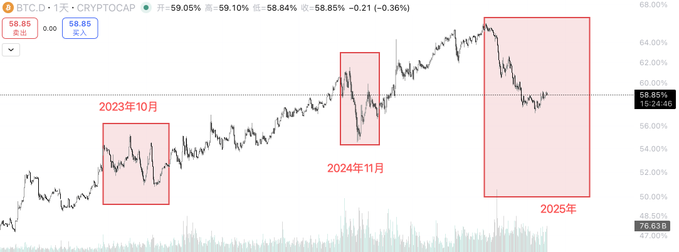 From the perspective of BTC.D, let's compare the scale of the bull market in 2023, 2024, and this year.
