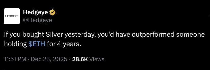 Anyone can make comparisons like this. Let me do the math: if you bought silver last month, it would have been better than holding ETH for eight years. Anyone can say something harsh like, "Why bother during a holiday? Crypto traders already have it tough enough."