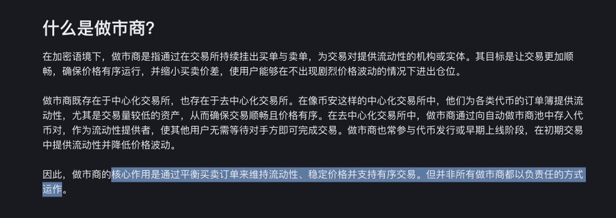 One-sided trading activity, without any buy orders to maintain it. This is a common risk signal directly pointed out in Binance's latest "Market Maker Risk Warning". I found this quite insightful. Over the past year, most Altcoin have been steadily declining in value. Many projects claim to have found market makers, but in reality, they may have found "high-end coin-selling institutions." In a normal market-making process, there should be both buy and sell orders, providing liquidity, narrowing price spreads, and stabilizing the market. However, some so-called market makers only sell and don't buy. Last year, I discussed this with many friends, and the conclusion was that market makers' logic is simple: since the price is likely to fall anyway, they sell first and then buy back at a lower price later. Cryptocurrency prices generally peak upon listing and then steadily decline, ultimately becoming a game of who can exit first. What's most frustrating is that some projects clearly announce the release of tokens, and the airdropped amount is small. The trading volume appears high, but the price keeps plummeting like it's on Viagra. You can't understand where the tokens are coming from or how they can keep selling. Undoubtedly, this isn't normal market making; it's highly likely a guise for continuous unloading of shares. If this continues, the country will cease to exist, and everything will fall into chaos. Binance has brought this issue to the forefront this time. I think the whole article was written relatively restrainedly, without naming names, but the meaning is very clear. This is not only a risk warning, but also a public rebuke to a group of market makers and project teams, and even has the flavor of an industry declaration. Especially in the current market conditions, this is also a warning to all project owners: who did the project owner hire as a market maker, how were the tokens distributed, and how did the other party sell them? They can't just deny knowing and deny it. They shouldn't pretend not to know anymore. Project owners have a responsibility to conduct due diligence and to continuously monitor the situation. It was also explicitly stated that chambers of commerce that violate regulations by engaging in market making will be blacklisted, and reporting of violations will also be allowed. This is tantamount to a message to market makers and project teams: stop packaging this fake market making and real distribution as normal market behavior. Binance is taking the initiative to assume industry responsibility and is preparing to redefine the rules for this industry. Market Maker Risk Warning | _2024111120230_ |