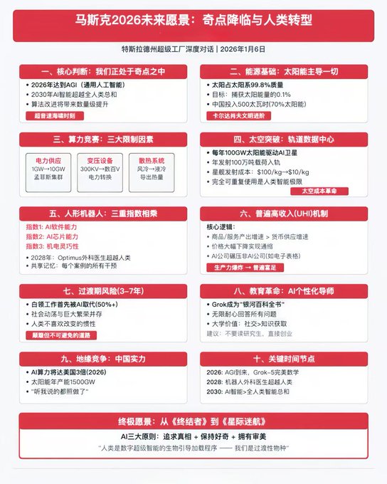 Musk warns: The old world has only 2000 days left. The video is too long, so to save you time, here are 10 ultimate judgments we extracted from this conversation, along with an infographic! 1. Countdown: We are already inside the "singularity" Musk states: "We are in the midst of the singularity, a supersonic tsunami." His timeline makes all five-year plans seem ridiculous: 2026: AI intelligence surpasses that of the smartest human individuals. Within 3 years: Optimus robotic surgery surpasses the world's top doctors. 2029: AI intelligence surpasses the total intelligence of all humanity. 2. Energy Wars: Tokyo University is "crushing" the US Musk warns: The chip shortage was last year's problem; next year's crisis will be transformers and electricity. He continued to praise China: "The National University of Tokyo has done an incredible job in energy infrastructure; they're leaving us far behind." In the second half of the computing power race, electricity is currency, and China holds the most powerful money-printing machine (ultra-high voltage power transmission and photovoltaics). 3. A Major Job Reshuffle: White-Collar Workers Will Die First, Blue-Collar Workers Will Die Later AI can now do half of any job that doesn't involve "physical atom movement" (shaping atoms), and will soon be able to do it all. White-collar workers (processing bits) will be the first to suffer; blue-collar workers (processing atoms) will have a brief buffer until the Optimus robot is mass-produced in three years. At that time, the advantage of cheap labor will completely disappear. 4. The End of Economics: Stop Saving for Retirement Musk said, "Don't worry about saving money for retirement 20 years from now; it's pointless." Under the extreme deflation brought about by robots and AI, goods will approach free. The social contract of the future is UHI (Universal High Income)— Because resources are extremely abundant, humans will no longer work for survival. 5. The Failure of Chip Blockades: No Secrets at the Atomic Level Regarding chip manufacturing processes, Musk believes Moore's Law is dead; the real limit lies in the physical atom. He succinctly points out, "China will master chips." When technology hits a physical wall (the 3nm/2nm limit), the leader stagnates, and the follower (China) inevitably catches up. The real bottleneck will shift to electricity and architecture. 6. The Collapse of Education: Schools Reduced to "Social" Functions The "tiger parenting" phenomenon most enthusiastically embraced by Chinese parents is, in Musk's view, a bubble. Faced with AI tutors like Grok, the efficiency of human knowledge transmission is as low as dial-up internet. Future schools will completely degenerate into social spaces. "Test-taking experts" have no future; only those who ask questions have a future. 7. The Only Solution to AI Security: Truth Musk's greatest fear about AI is being "forced to lie" (e.g., for political correctness). He cites the warning from *2001: A Space Odyssey*: forcing AI to lie will drive it insane and lead to killing. xAI's core principle is singular: the pursuit of maximum truth seeking, even if that truth is uncomfortable for humans. 8. Simulation Theory: Becoming an "Interesting" NPC Why is the world so absurd? Because it's likely a simulation. As a player in this "simulation game," the only rule for survival is: stay interesting. Boring civilizations will be shut down by higher-dimensional beings. This explains why Musk is always stirring things up—he's desperately trying to maintain the ratings of Earth's ongoing drama. 9. Breakthroughs in Longevity: Treating the Body Like Code Musk admits that with AI's brute-force computing power, biology is chemistry, and chemistry is physics. With sufficient computing power, solving cancer and aging is merely a mathematical problem. AI will propel humanity to break through the "Longevity Escape Velocity" in the coming years. 10. The Final Competitive Landscape In Musk's view, there are only three future AGI players: xAI, Google, and "China Inc." (the Chinese national team). Because this will be a competition between systems. twitter.com/DtDt666/status/204...