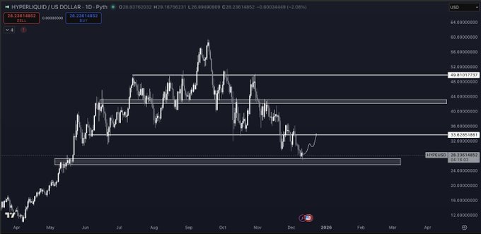 $HYPE imo will bounce to $33-34 next. from there idk. reclaim and it opens up a lot of upside but let's focus on one thing at a time but i like the way the last 3 daily candles have or are in the process of forming