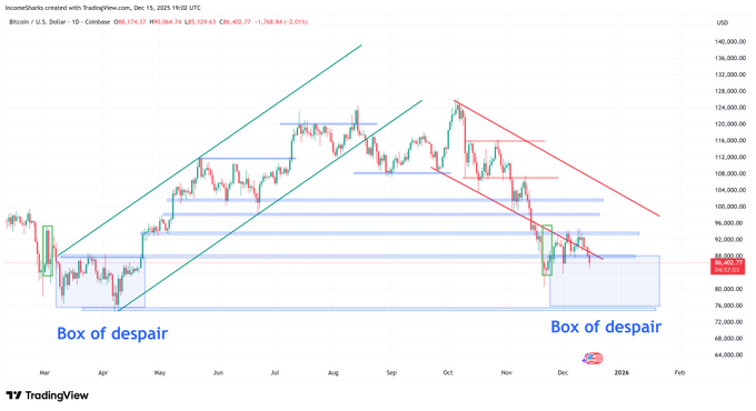 Bitcoin back into the box of despair. Every bottom will give you plenty of time to build a position but will wear you out mentally before it goes back up. twitter.com/IncomeSharks/statu...