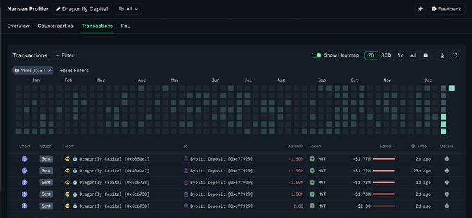 .@dragonfly_xyz (Dragonfly Capital) continues depositing $MNT to @Bybit_Official. Over the past 7 days, they've already sent 6,000,000 $MNT (~$6.95M USD) They still hold 9.15M tokens across multiple wallets, worth around $10.76M.