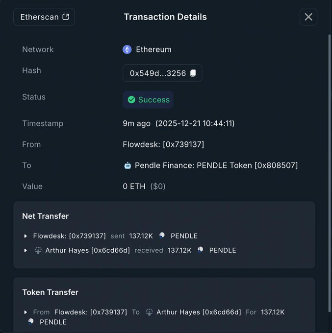 .@cryptohayes (Arthur Hayes) just received 137,117.41 $PENDLE ($259,183.61) from Flowdesk