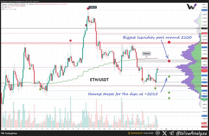 Ethereum lost Daily 20sma last week. This week we may see it re-test this dynamic SR level to cover FVG and HUGE liquidity pool around 2100. That is the most attractive zone on the chart.