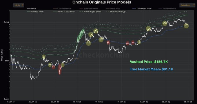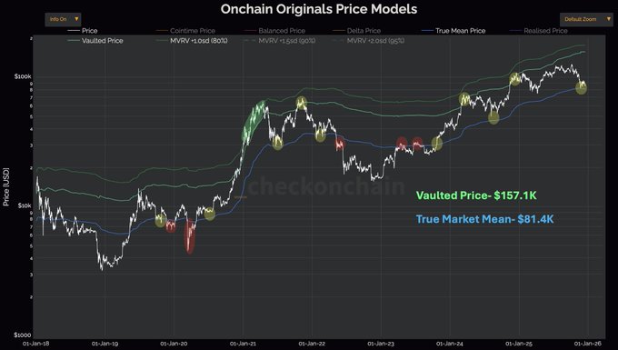 Bitcoin continues to range between Vaulted Price (~$157K) & the True Market Mean (~$81K). Each bull cycle, price has pushed far above the Vaulted Price during the top. This would be the 1st cycle in Bitcoin's history that ended in such a muted manner.. ..or BTC isn't done yet