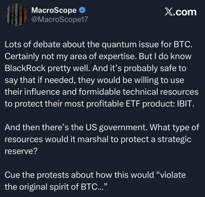 I share a similar view to @MacroScope17 here. While the fear of the unknown and concerns for QC are taking over the timeline, it’s best to think logically about who is now involved with Bitcoin and how their incentives align with protecting BTC.