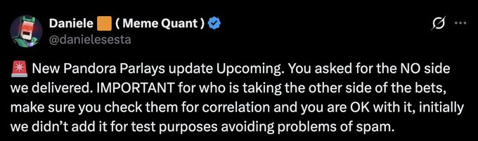 Another great update is coming to @thisispandoraai! @danielesesta just announced that you'll be able to take the 'No' side of a bet on Pandora very soon. This will make creating parlays even more powerful💪 twitter.com/CryptoJonesRC/stat...