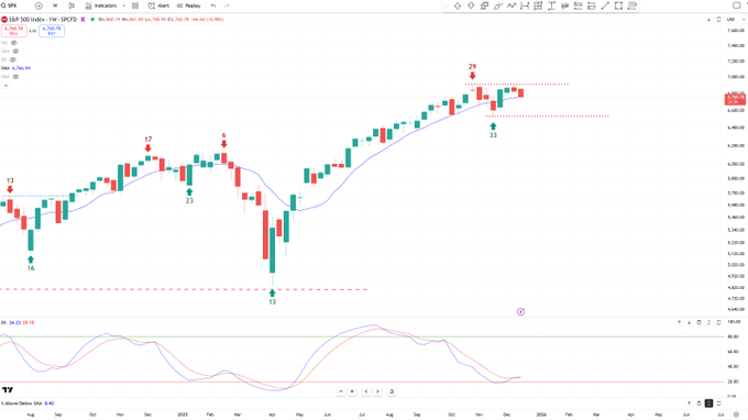 Stocks still look ok, remaining patient. 8-Week range, currently on just Week 4 of the Cycle. Chopping around below ATH's. Only thing to worry about is the Cycle Low 6,521, otherwise noise before the next leg higher.