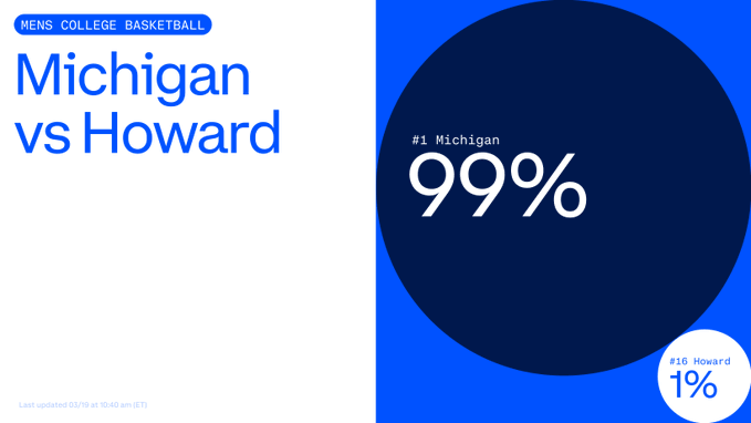 Madness is in full swing. Howard just won their first-ever tournament game on Tuesday, but are now facing a 1% chance to beat Michigan.