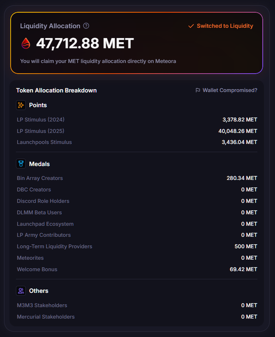 One of my wallets for the Meteora airdrop Was probably one of the biggest cooks of the last couple of years for those who properly farmed the f out of it, I stopped ages ago and still got a pretty legit drop MET trading at ~$1.50 premarket How'd you do?
