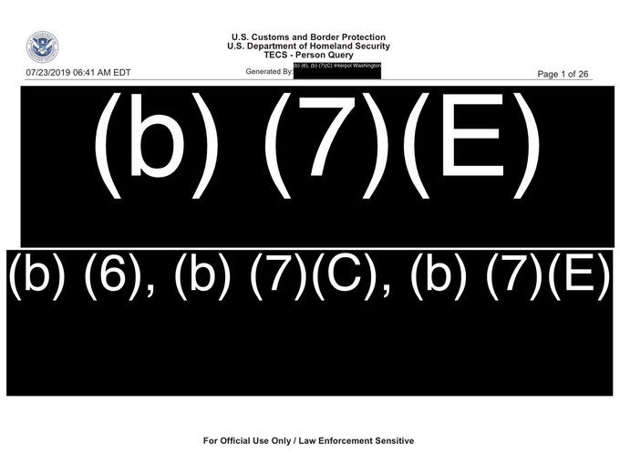 Most of the redactions are claiming a: -6 (privacy) -7E (disclosure of law enforcement procedures) -7C (unwarranted invasion of privacy) Each of those types of redactions is supposed to be incredibly small in scope. There is no time that should apply to such large blocks of text. twitter.com/adamscochran/statu...