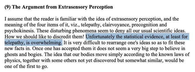 Alan Turing: "Unfortunately the statistical evidence, at least for telepathy, is overwhelming." twitter.com/TylerAlterman/stat...