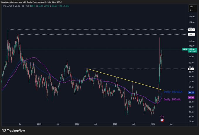 The conflict goes on, and so does $OIL. It is now up +65% in the past 6 weeks alone. Putting pressure on inflation and risk assets at the same time. As long as the conflict goes on, a $100+ OIL price is likely to remain. The longer it remains, the worse the outfall of the situation will be. twitter.com/DaanCrypto/status/...