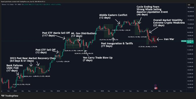 $BTC This cycle's overview updated: Bitcoin still has not made new lows during this conflict, as the previous drop to $60K has not been retested as of now. So where crypto sold off by itself from October to February, it has held relatively stable thus far during this conflict. This is while stocks have took quite the dive over the past few weeks. But there also doesn't really seem any risk appetite towards crypto either, keeping us in this limbo phase where it's just a waiting game for the next big move.