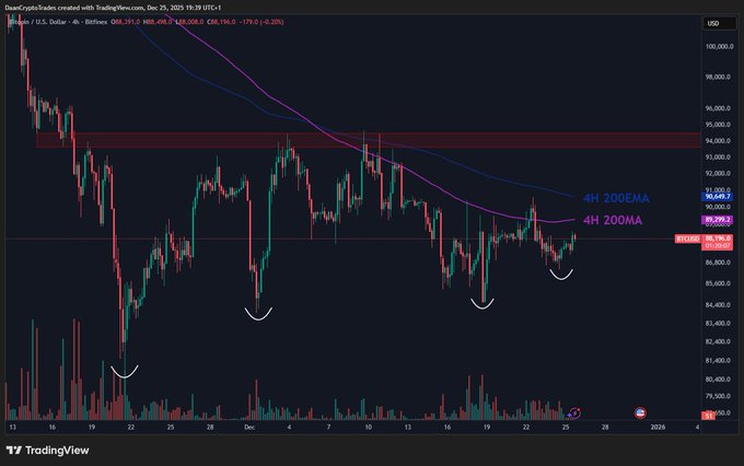 $BTC Marginally higher lows while the 4H 200MA/EMA act as resistance.