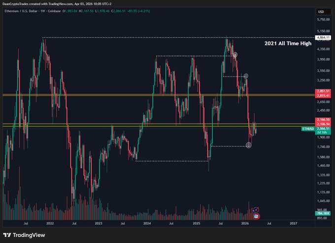 $ETH Bulls would want to close back above $2.1K on the weekly. Otherwise these past few weeks were just a lot of failed breakouts and bearish retests. Either way, I am not interested in doing much until we get a decisive break of the range we've been trading in the past 6-7 weeks now.