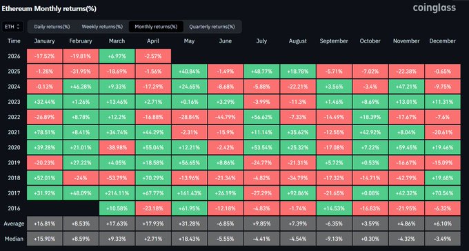 Historically speaking, the first 5 months of the year are amazing for $ETH. But last year that already didn't happen, and neither did this year so far. Having said that, May does tend to be a great month for ETH with the best performance by almost a 2x multiple to the second best month. These are of course just averages, but still interesting to keep track of.