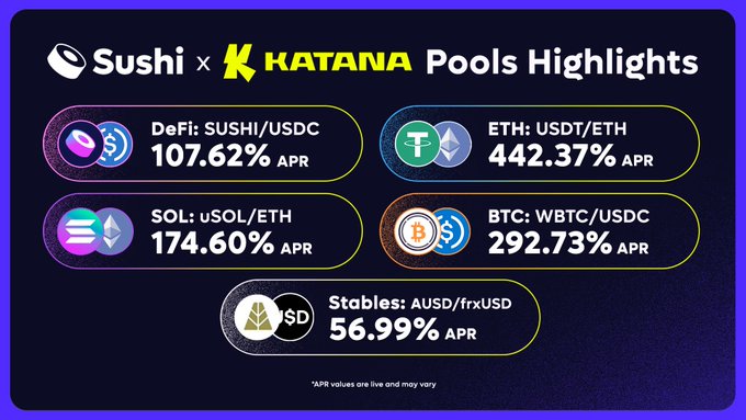 Your weekly @katana pool highlights are here ⚔️🍣 🟠 BTC: WBTC/USDC – 292.73% APR 🪙 ETH: USDT/ETH – 442.37% APR 🍣 DeFi: SUSHI/USDC – 107.62% APR 🟣 SOL: uSOL/ETH – 174.60% APR 🧊 Stables: AUSD/frxUSD – 56.99% APR