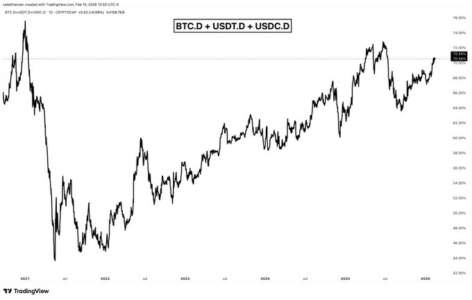 Bitcoin Dominance + Stablecoin Dominance is trading at its highest levels since July 2025.
