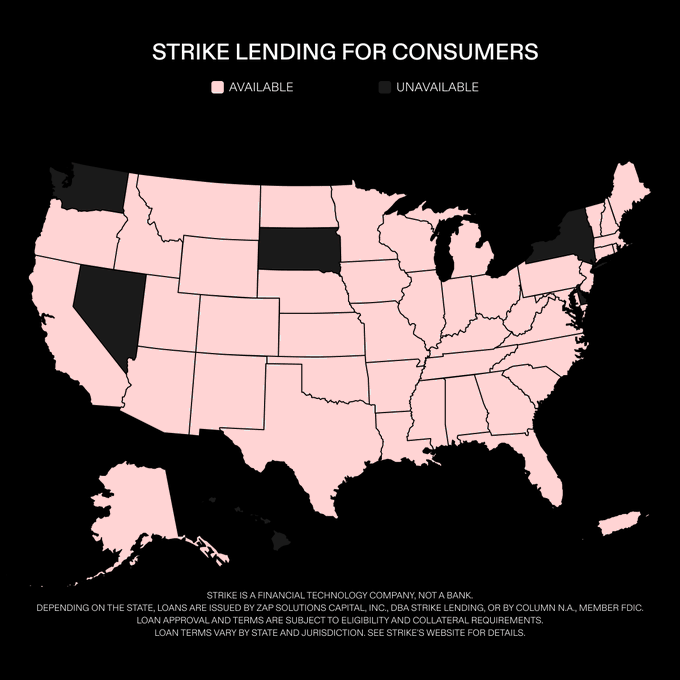 In the last week Strike Lending: ✅ Launched in Texas and Alabama ✅ Lowered minimums in Indiana ✅ Updated our margin call policy to give clients more flexibility Nearly all of the U.S. now has access. We're working to make Bitcoin-backed credit accessible to everyone.