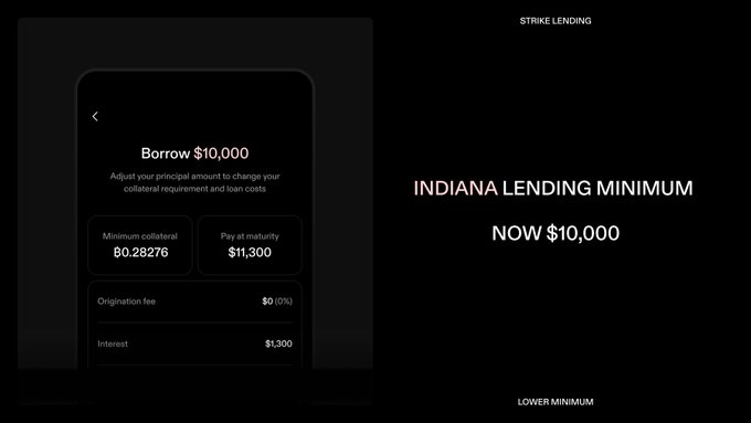 We have lowered loan minimums for Indiana. Lower minimums expand access, enable more people to borrow against their stack, and create real scale for bitcoin-backed credit. We've been working relentlessly to bring those minimums down everywhere. Indiana today, everywhere soon.