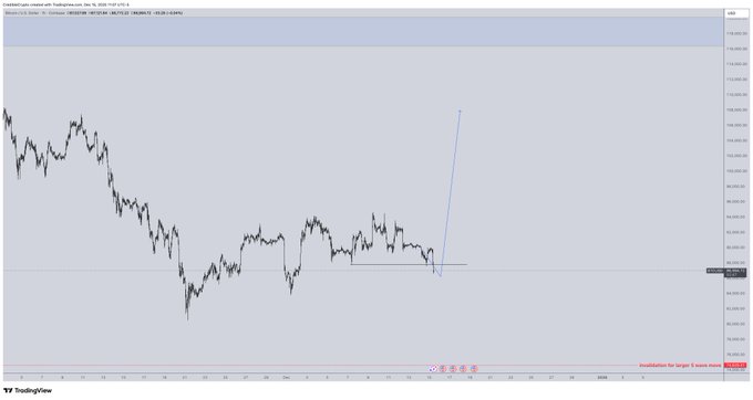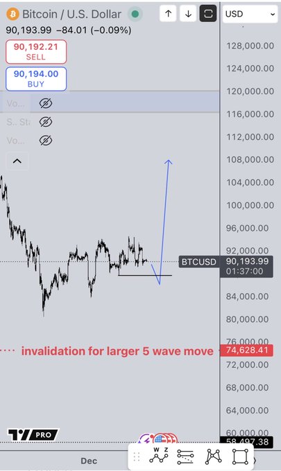 This sideways chop on LTF as a subwave 2 of a larger 5 wave move up after a LTF subwave 1 impulse off of 83.8k OR this chop a B wave after a subwave A impulse off of 83.8k. Either way would imply at minimum another LTF move up as long as lows at 83.8k are held. Then we see if we are getting the first scenario which would imply a full on reversal off of 83.8k to new ATH OR the second scenario which would imply further chopsolidation as opposed to an immediate reversal. Too early to tell which scenario we may be getting but either way things look solid here and ideally with developing PA we have reasons to become even more bullish.