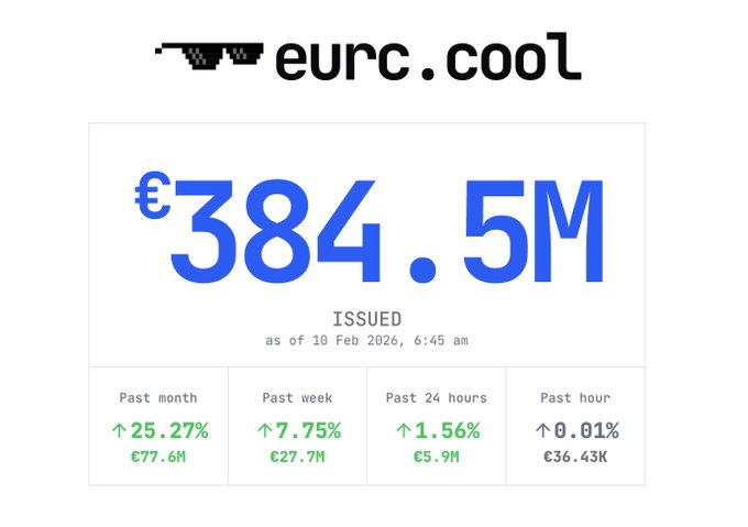 EURC crossed €380M in market cap - adding more circulation in the past month alone than the next-largest euro stablecoin has in total. Onwards! 💶