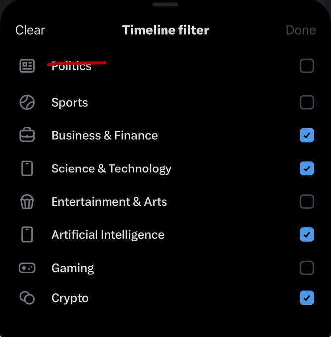 Holy AWESOME! I just scrolled my timeline for the first time with the FOR YOU FILTER that was just added… 🔥Politics NOT selected Feels like a pressure valve of peak-fear- propaganda has been shut off… Thank you @elonmusk & @nikitabier