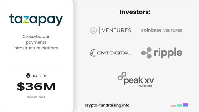 Cross-border payments infrastructure platform @tazapay raised $36M in a Series B funding round led by @circle_ventures, with participation from @CMT_Digital, @cbventures, @peakxvpartners, @gmovp, @January_Capital, @Ripple, Norinchukin Capital, ARC180, @rtpvc.