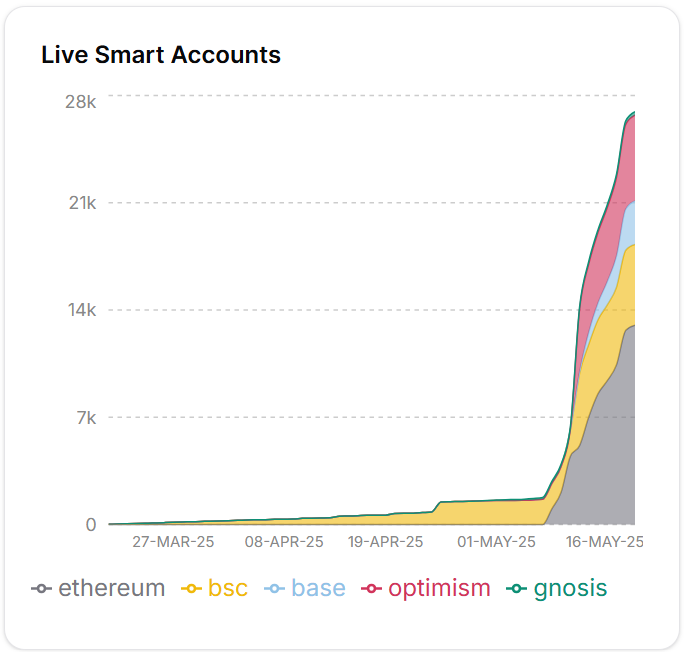 EIP-7702 launched last week. More than 25,000 wallets are currently upgraded to EIP-7702 smart accounts. - 13,013 on Ethereum - 5,588 on OP Mainnet - 5,261 on BSC - 2,851 on Base - 229 on Gnosis