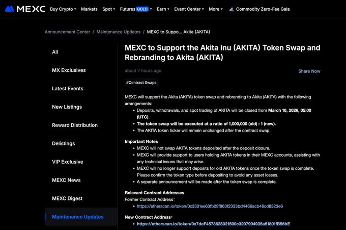 ✅@MEXC_Official has officially announced support for the AKITA contract upgrade and token swap. Deposits, withdrawals, and spot trading will pause on Mar 10 (6am CET) during the migration. Details below 👇 mexc.com/announcements/article...…
