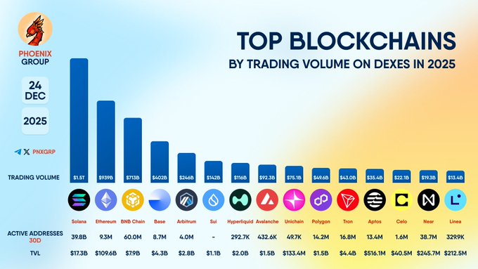 Top Blockchains by Trading Volume on DEXES in 2025. 👀 1. Solana 🥇 2. Ethereum 🥈 3. BNB Chain 🥉
