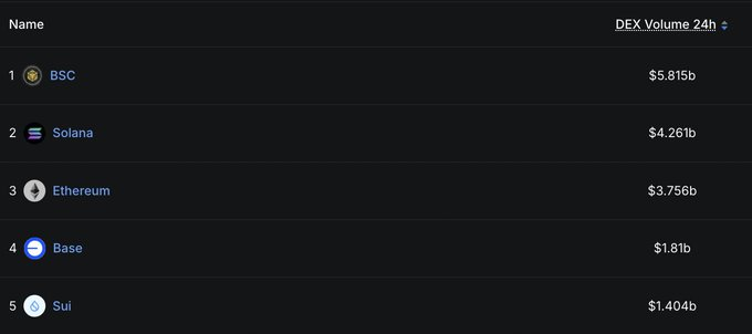 BSC leads DEX volume in the past 24 hours with $5.815B ๐ Can $SOL reclaim the top spot? ๐ง
