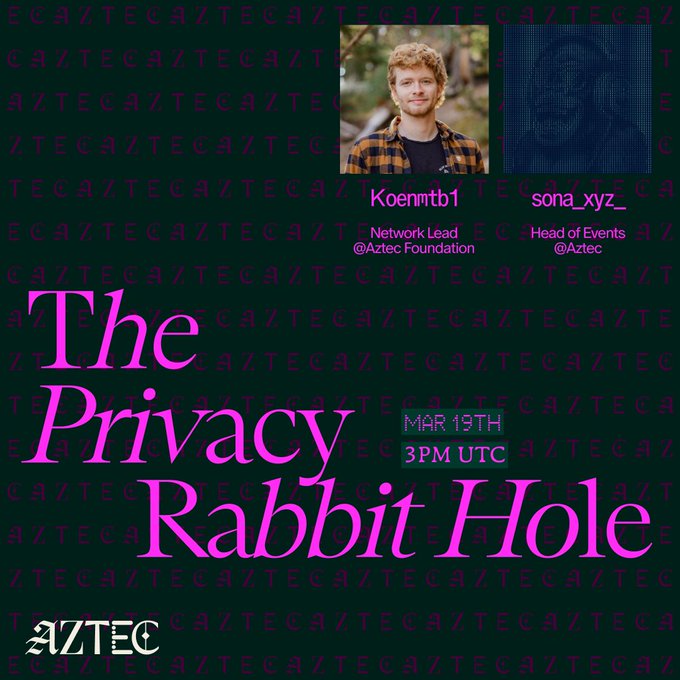 The Privacy Rabbit Hole is back 🪿 Tomorrow | Mar 19th | 3PM UTC @Koenmtb1 — diving into our latest governance blog @sona_xyz_ — breaking down Aztec's presence at @EthCC