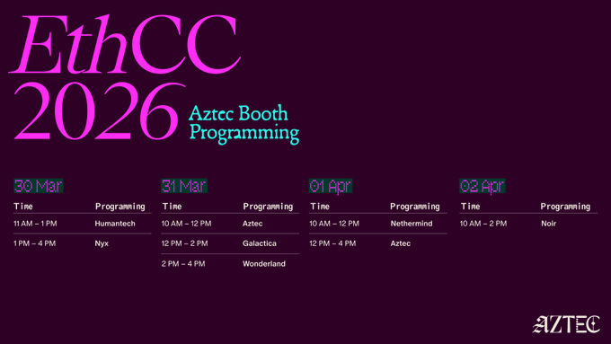 Next week, Aztec is taking over @EthCC with a full booth lineup. Come meet the team, explore projects building on Aztec, get privacy pilled, and see what Privacy in 2026 will look like.