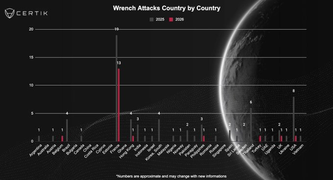 #CertiKInsight 🚨 We previously highlighted that France had the highest number of wrench attacks in 2025 with a total of 19 attacks. Since the beginning of the year, France has recorded at least 13 wrench attacks, making it the country most affected by this type of incident.