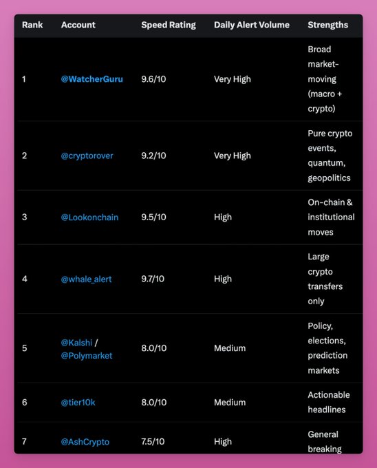Tired of the same "BREAKING" and "JUST IN" engagement farming. My Grok research results show that Watcher Guru and Whale Alert are the quickest to report. Others usually copy-paste to ride the wave. Especially Kalshi and Polymarket. Probably smart to keep a few and mute others.
