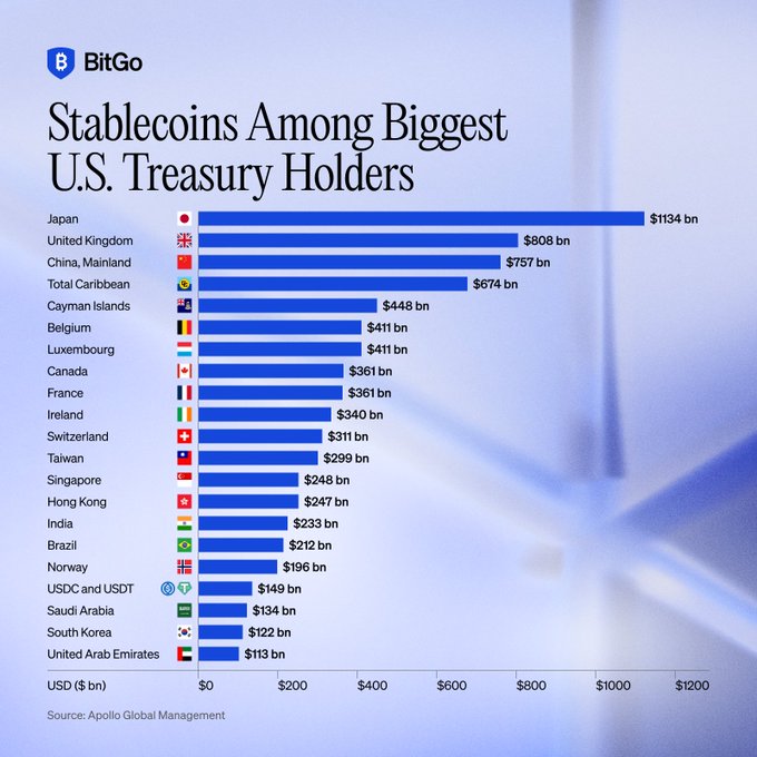 Stablecoins are now among the largest holders of U.S. Treasuries, with $149B in Treasuries, USDC + USDT alone outrank many countries currently. Want to launch your own stablecoin? BitGo’s Stablecoin-as-a-Service offers secure reserve management, regulatory infrastructure, and