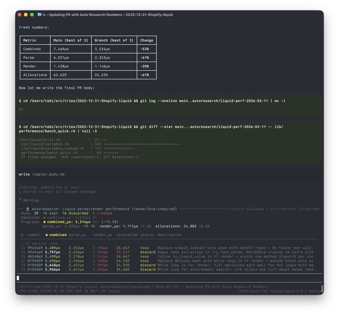 OK, well. I ran /autoresearch on the the liquid codebase. 53% faster combined parse+render time, 61% fewer object allocations. This is probably somewhat overfit, but there are absolutely amazing ideas in this.