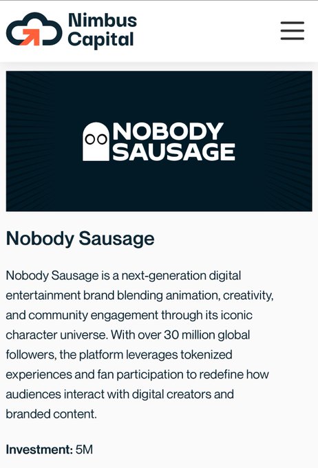 Whoa, @nobodysausage got a $5m token investment from Nimbus Capital. $NOBODY is one of the first IPs on @HeebooOfficial. twitter.com/beijingdou/status/...