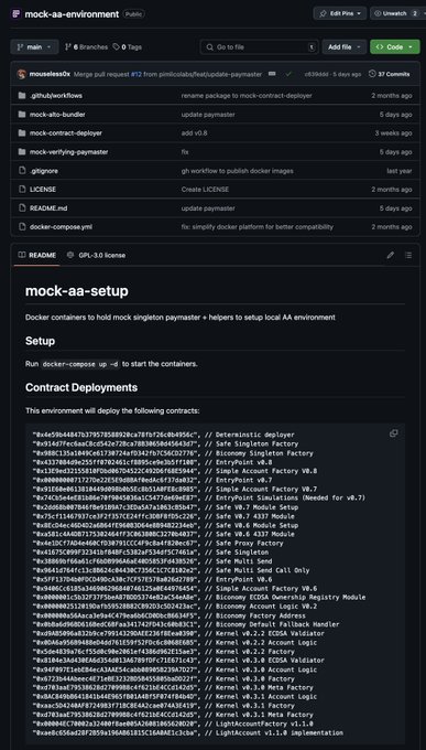 our mock AA environment repo now supports EntryPoint v0.8 and EIP-7702 the docker container now deploys: - v0.8 entrypoint and accounts (e.g. Simple7702Account) - v0.8 paymasters - Alto with v0.8 and EIP-7702 support should make local testing with ERC-4337 & EIP-7702 a breeze!